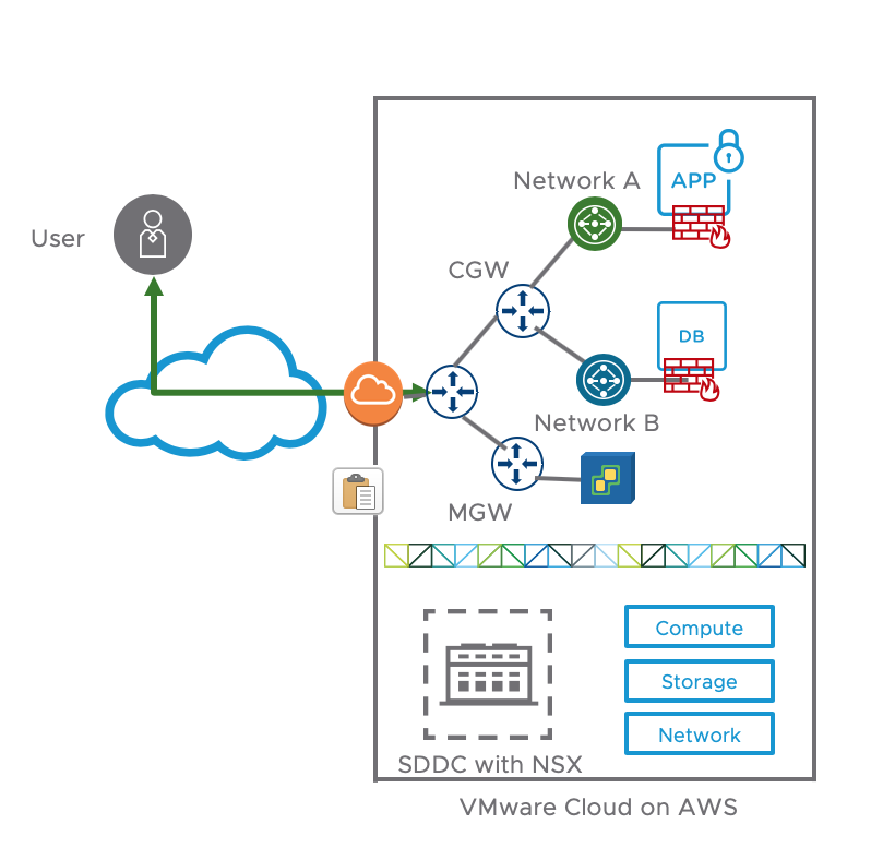 In this scenario, no access to the on-prem DC is actually required and only access to vCenter from Internet is required to start building and securing applications running on VMC.
