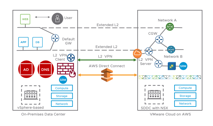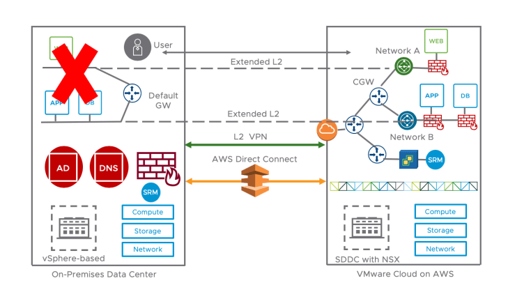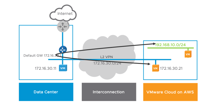 In this case, we would recommend the NSX L2VPN to stretch the network between the two sites. During the failover, the application would automatically be restarted on VMC and the VMs would boot on the ‘extended L2’ network and boot up with the same IP addresses.