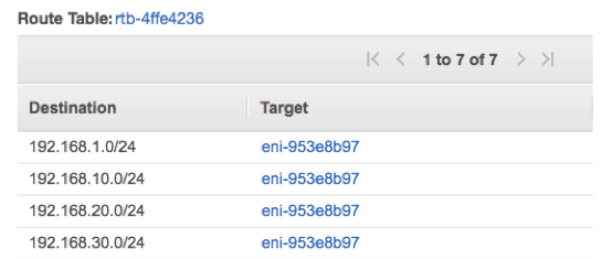 Here is the partial view of route table of the VPC attached to VMware Cloud on AWS. The 192.168.1.0/24, 192.168.10.0/24, 192.168.20.0/24 and 192.168.30.0/24 network segments were created on VMware Cloud on AWS and the VPC is immediately updated with these routes with a target of the ENI attached to the CGW.