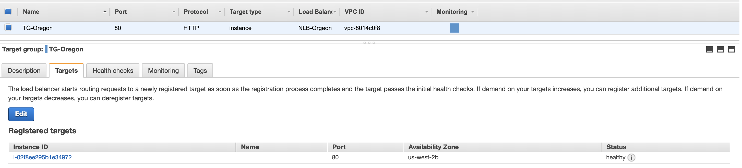 In Oregon and Frankfurt, I have built a Network Load Balancer and a Target Group attached to the Network Load Balancer that tracks the health of the web server (1 EC2 instance in Oregon and 4 Web Servers in my SDDC in Frankfurt):