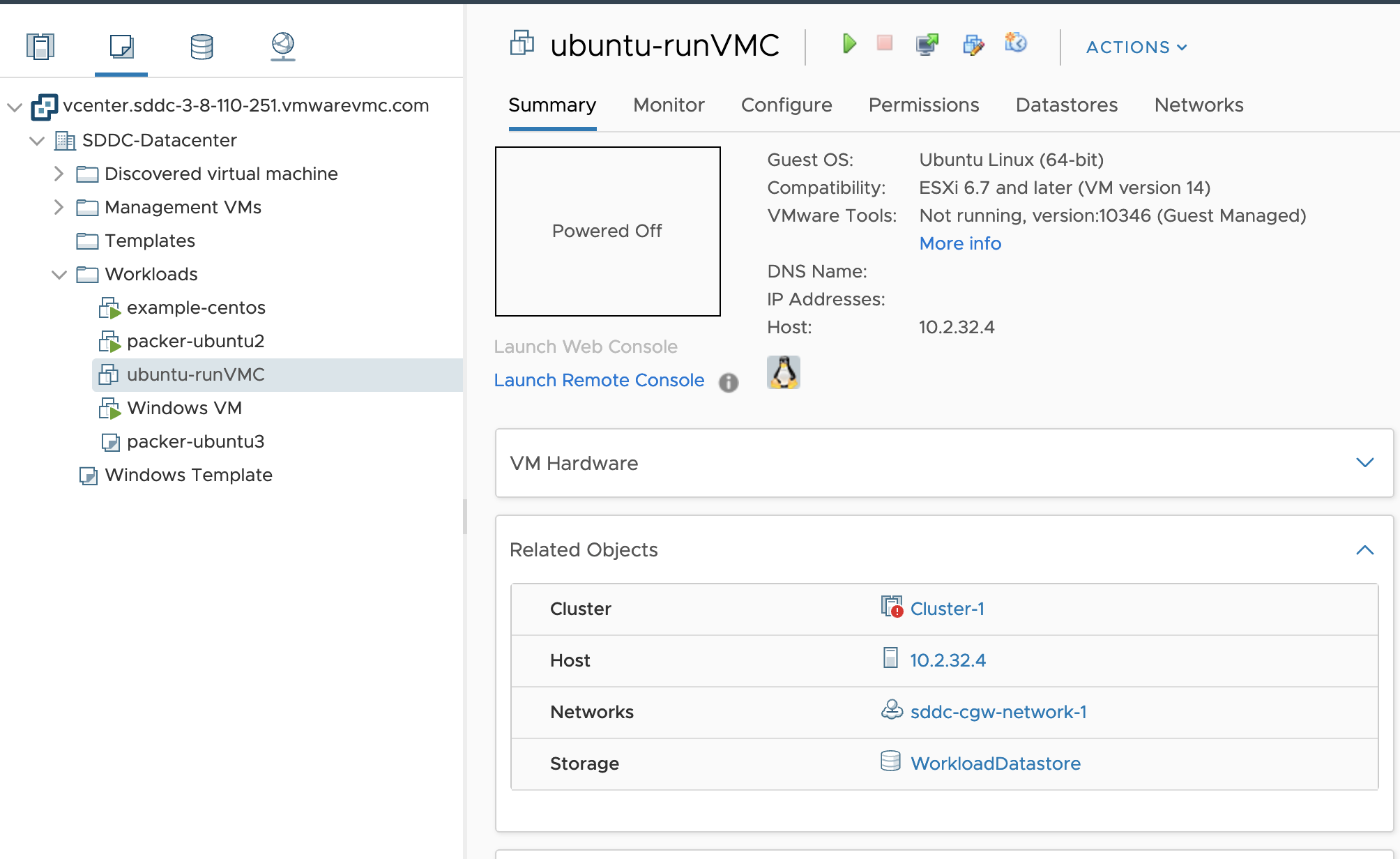 - It will be attached to “sddc-cgw-network-1” which a DHCP-enabled network in my VMware Cloud environment.