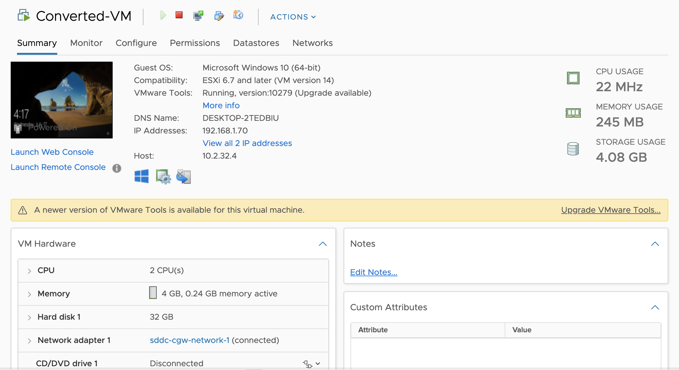 Let’s look at the end-result: we now have a VM connected to the network I specified, with the boring name I picked (“Converted-VM”) and on hardware version 14.