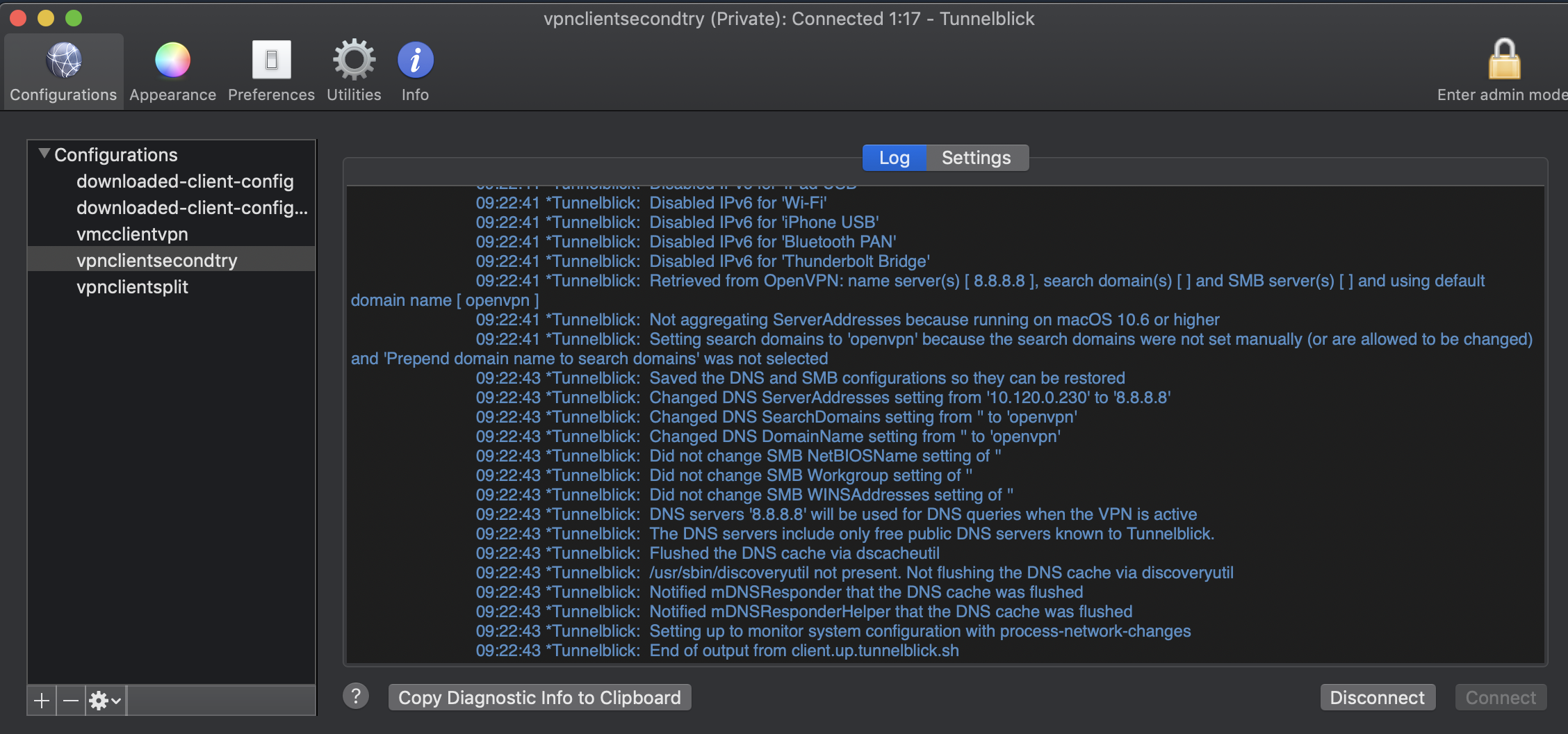 To install this configuration file, drag and drop it on the Tunnelblick icon in the menu bar, press Connect and you’re good to go!