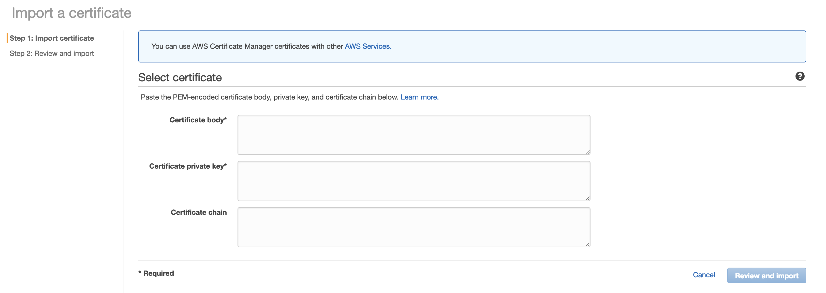 Log onto the AWS Console and go the AWS Certificate Manager. Click on “Import Certificate”.