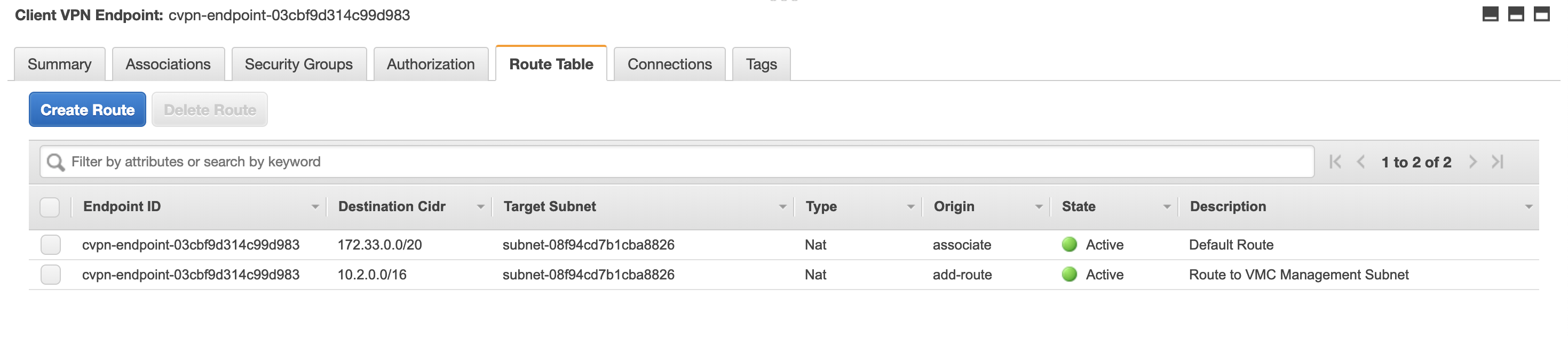 To access a network beyond your local VPC (such as a peered VPC, a remote site or your VMware Cloud on AWS SDDC), you need to create a route at this stage. The 10.2.0.0/16 route in the table below is the management network of the VMware Cloud on AWS SDDC connected to the VPC where the VPN endpoint is connected. Having this route in the VPN Route Table forces the traffic from my remote client towards 10.2.0.0/16 over the VPN. Make sure the remote site has a route back to the network of your remote clients.