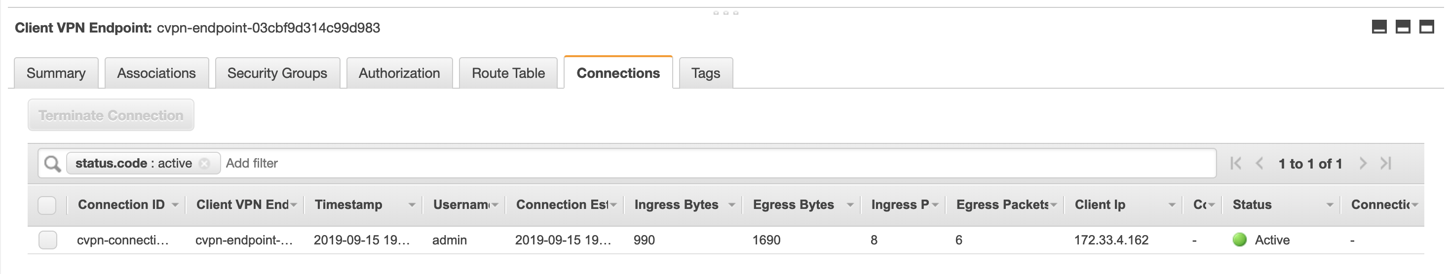 Once your VPN connection is up and running, your connection will appear on the AWS console: