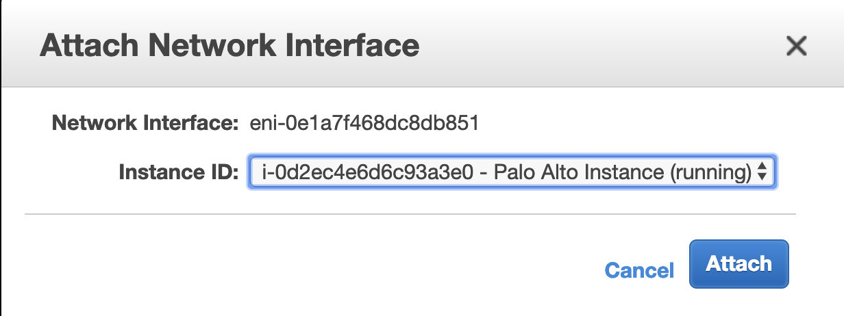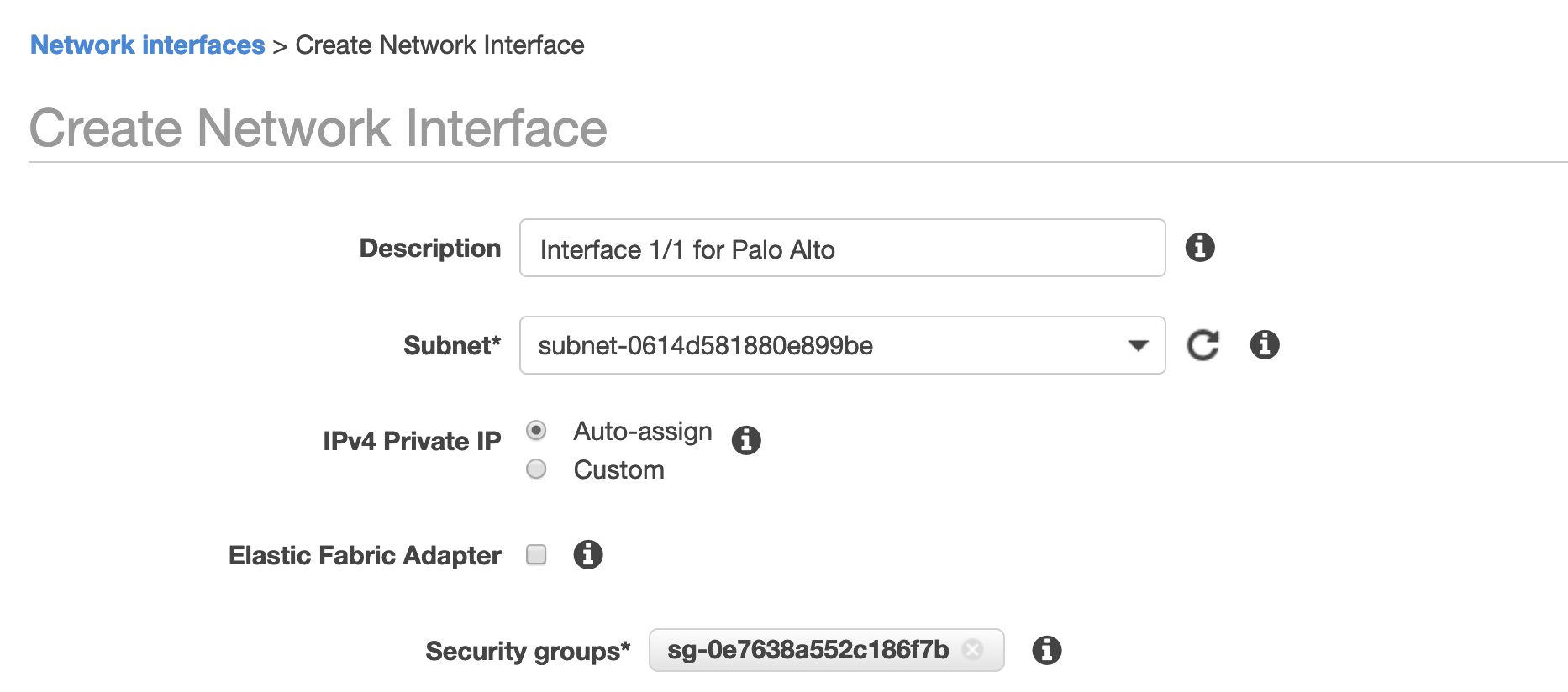 Now you need to go back to the AWS console and create a network interface for the Palo Alto (right now, your Palo Alto only has a management interface but no actual interface to carry data traffic). This is going to referred to our interface ethernet 1/1 later on.