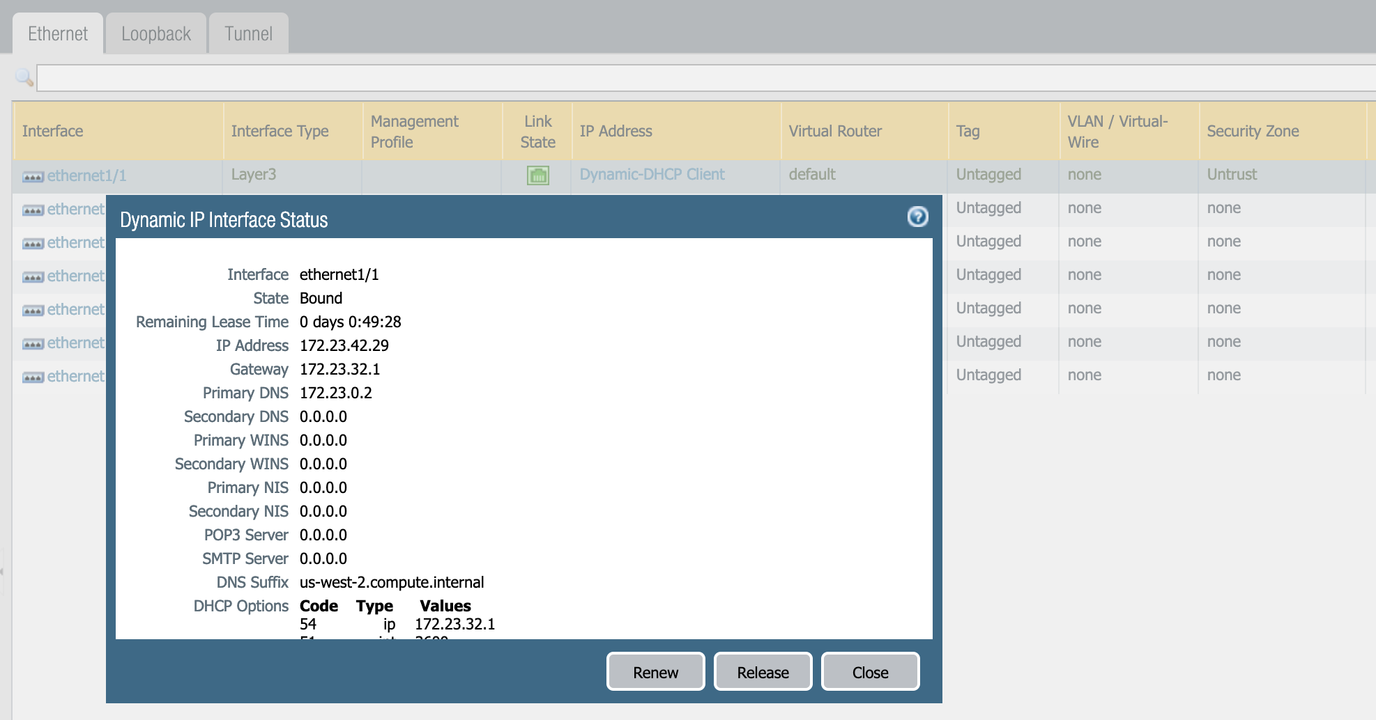 When you log onto the user interface of the PAN, you will see an ethernet 1/1 interface (in Network/Interfaces/Ethernet menu). It should have picked up an IP as expected: