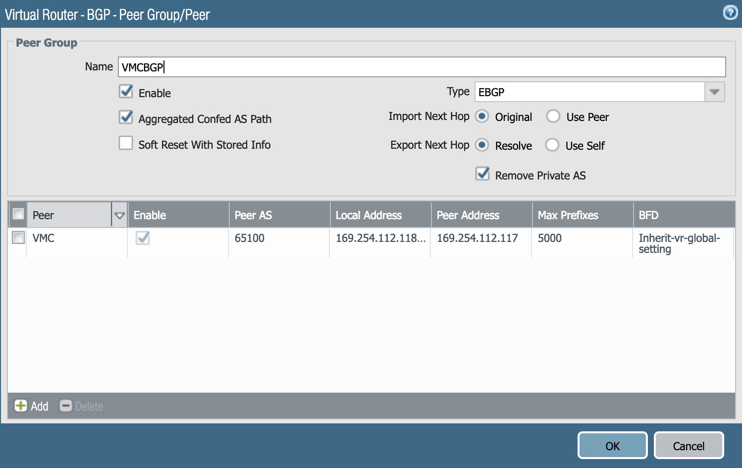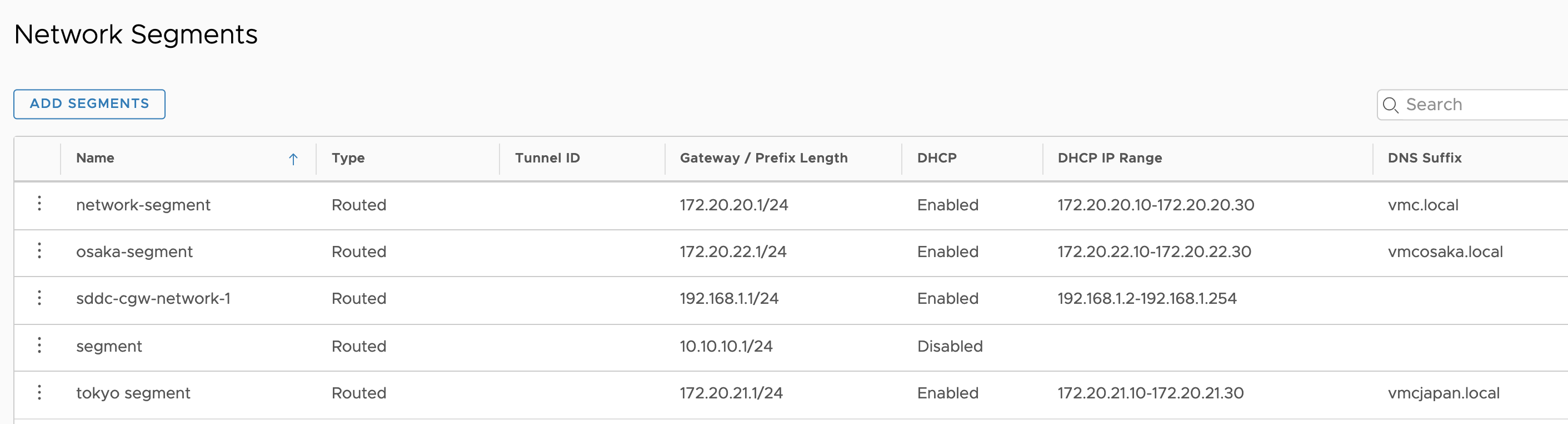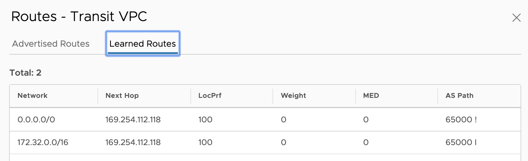 When you look at the routes advertised from VMC, we can see all the local network segments and the management subnet (10.2.0.0/16):