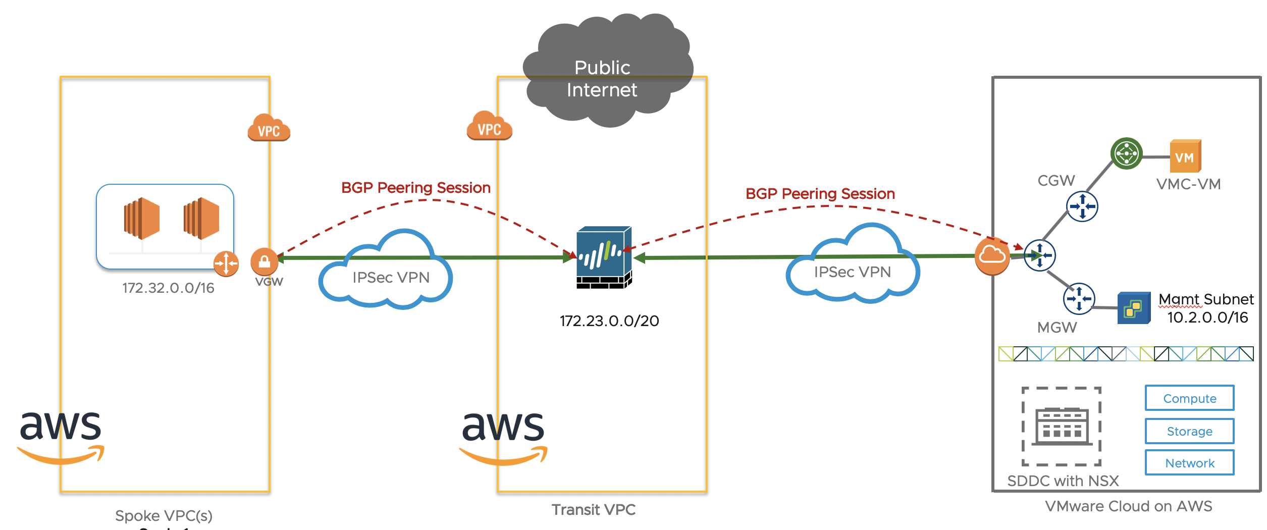 In the context of VMware Cloud on AWS, the VMC SDDC is just considered another “spoke VPC” and we can just set up a couple of VPN tunnels from the next-gen FW to the VMware Cloud on AWS gateway.