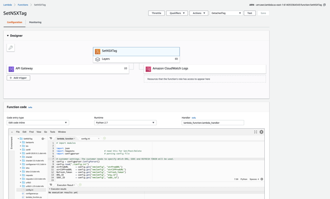 Once AWS API Gateway received the packet from vRealize Log Insight Cloud, the AWS Lambda function SetNSXTag is executed.