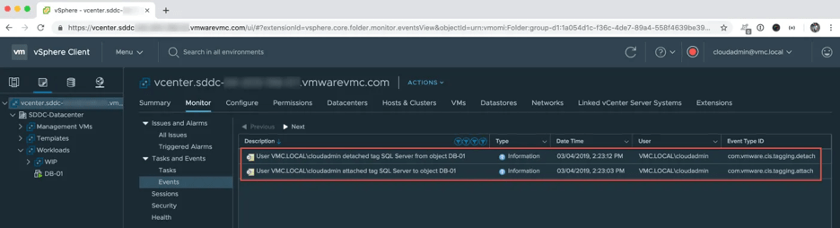 As William described in his blog post, whenever a user assigns or removes a tag from a VM in vCenter, an event is raised. For VMware Cloud on AWS customers, all vCenters events are exported into our Logging-As-A-Service platform (Log Intelligence, also known as vRealize Log Insight Cloud – vRLIC).