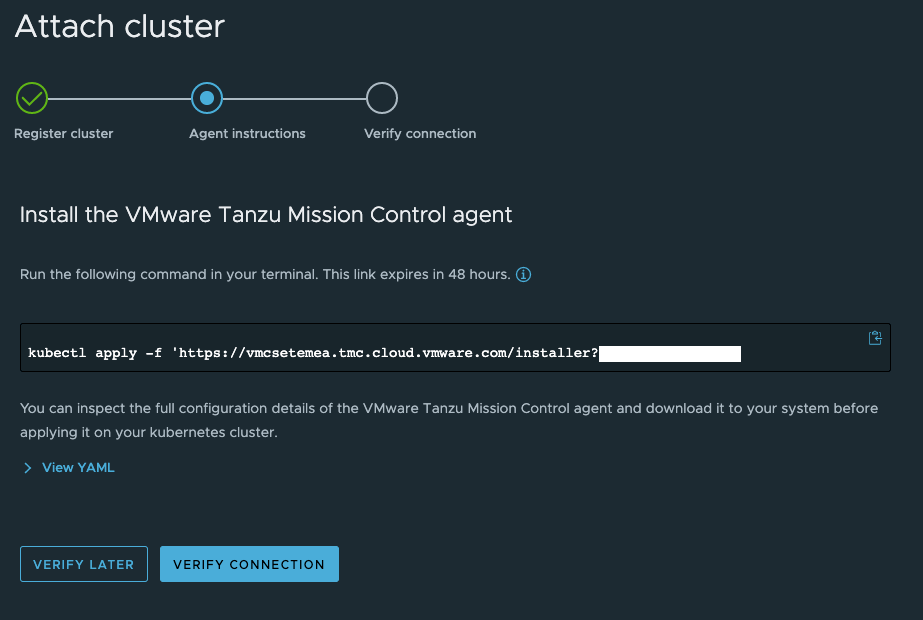 kubectl apply -f 'https://vmcsetemea.tmc.cloud.vmware.com/installer?XXXXXXXXX'
