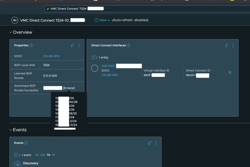Finally, we also have something new that came up with the latest release of vRNI 5.2: the integration with Direct Connect – we can now see on the vRNI Dashboard details about the DX used (such as the Direct Connect ID and the Virtual Interface (VIF)) and the routes learned and advertised over BGP:
