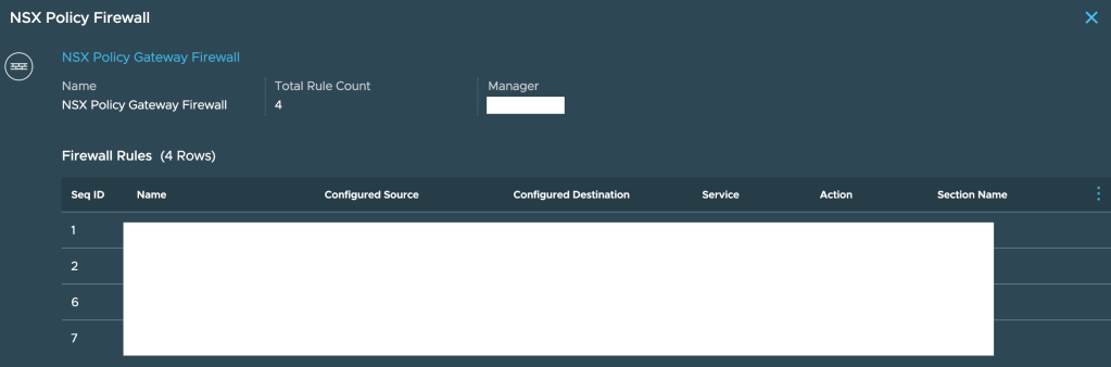 And then across the T1/T0 routers before heading out to the Internet. Click on the Firewall next to T0 to see the ‘edge firewall’ rules applicable to this traffic: