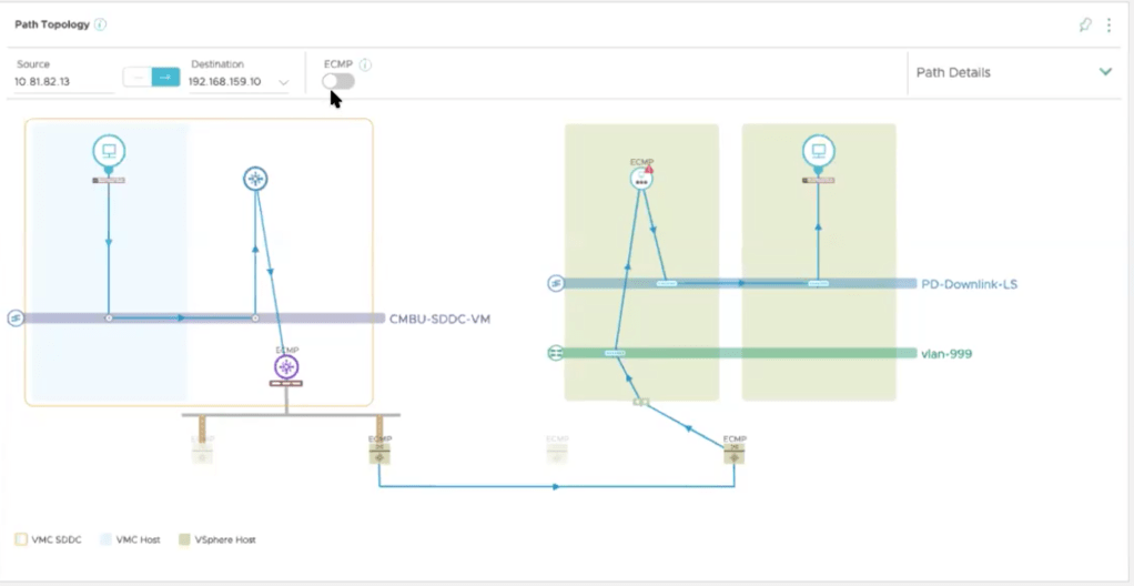 Even better, you can see the traffic from a VM on VMC accessing a VM on-prem like in the picture below. You need the ability to add the DX customer router as a data source to see this path – I didn’t have the ability to do this in my lab so I borrowed this picture from Martijn.