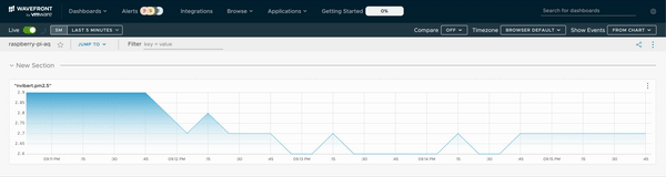 I set out to send the AQ data collected from the Raspberry Pi to get them displayed on a Wavefront dashboard. To get the data from the Pi to the Cloud-hosted Wavefront portal, you can either send it directly (Direct Data Ingestion) or via a Wavefront proxy.