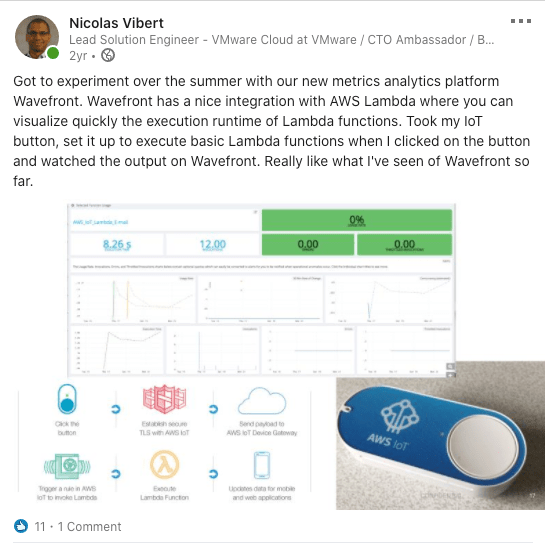 Anyway, back to Wavefront – while it went a bit under the radar since the acquisition, it turns out it’s being used at scale by operators that need to understand application and infrastructure performance. That includes the VMware team supporting VMware Cloud on AWS operations – they use it extensively (read more here).