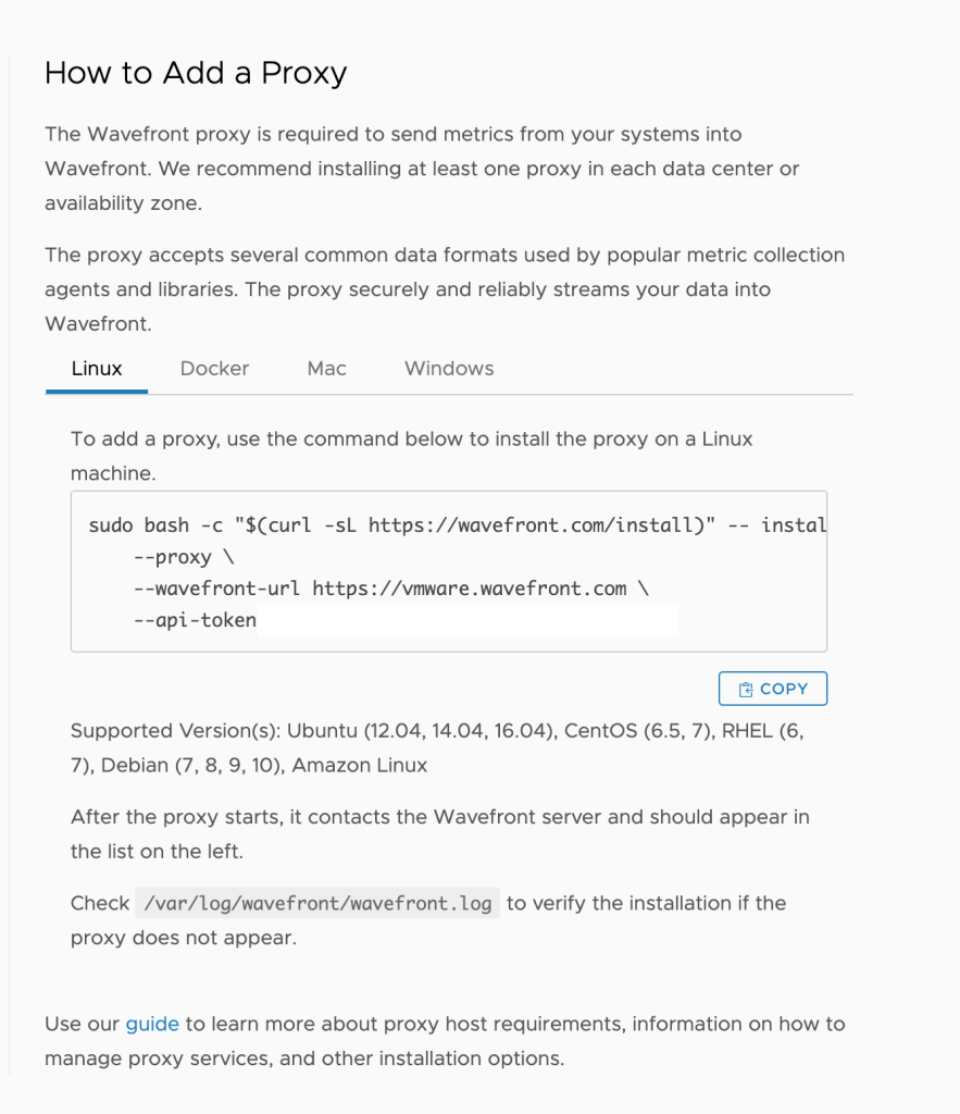 On my EC2 Amazon Linux instance, I ran the command (see highlighted lines). I’ve hidden the API token but that’s essentially how we authenticate and secure the communications from the proxy to the Wavefront portal.
