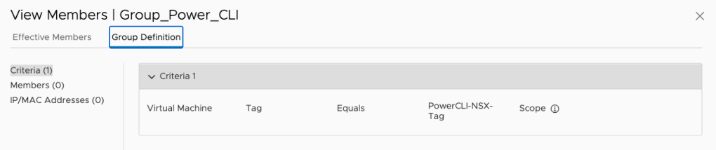 PS /Users/nicolasvibert> New-NSXTGroup -Name Group_Power_CLI -GatewayType CGW -Tag "PowerCLI-NSX-Tag"