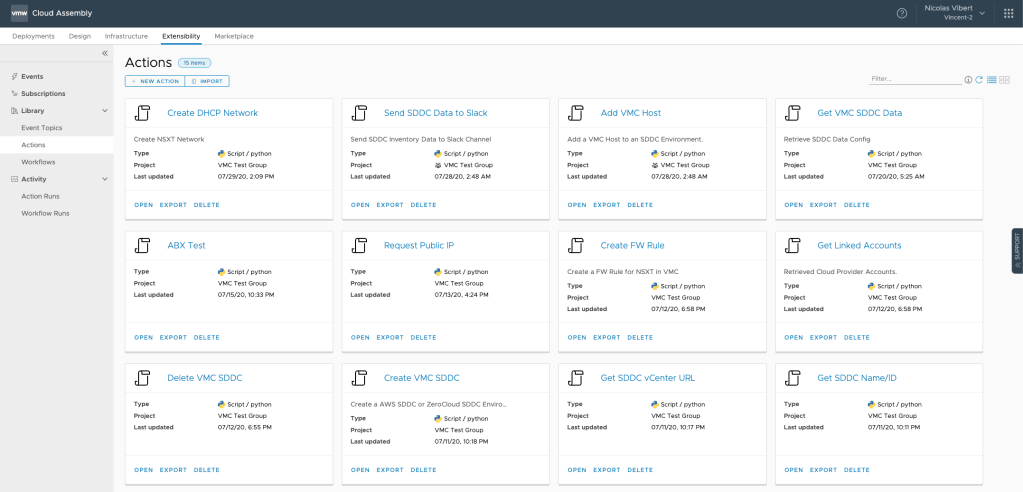 First, make your way to vRealize Cloud Assembly, where we will create a number of Actions (such as creating a network) that we can publish on the catalog for the end-users to access: