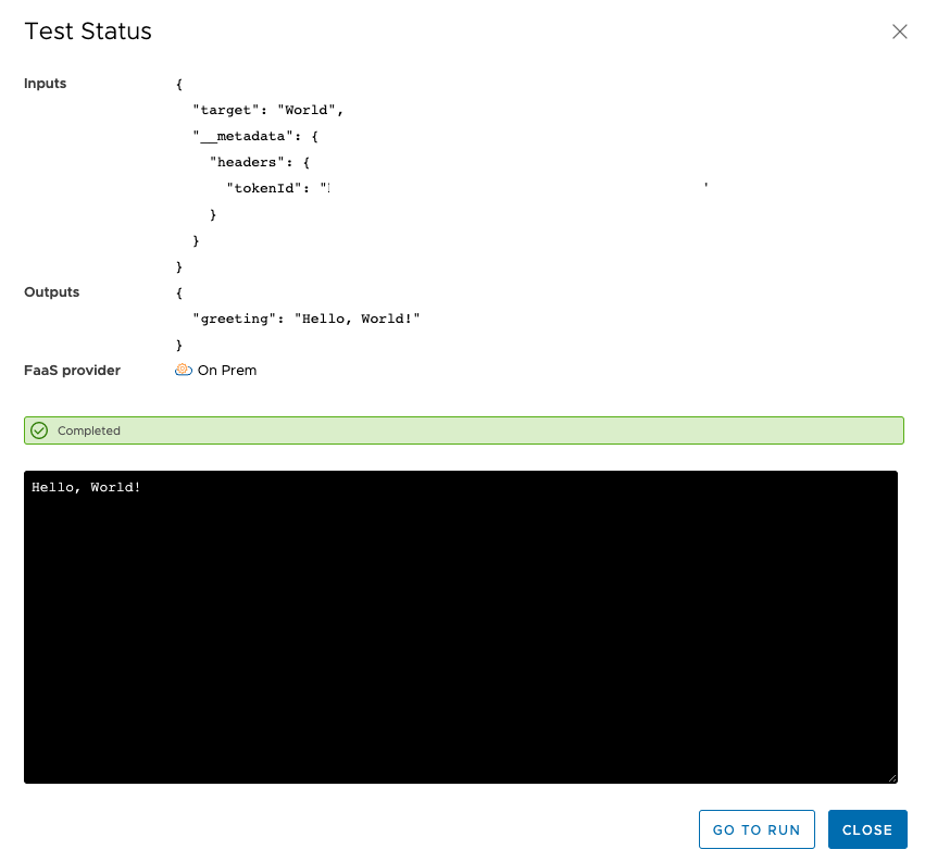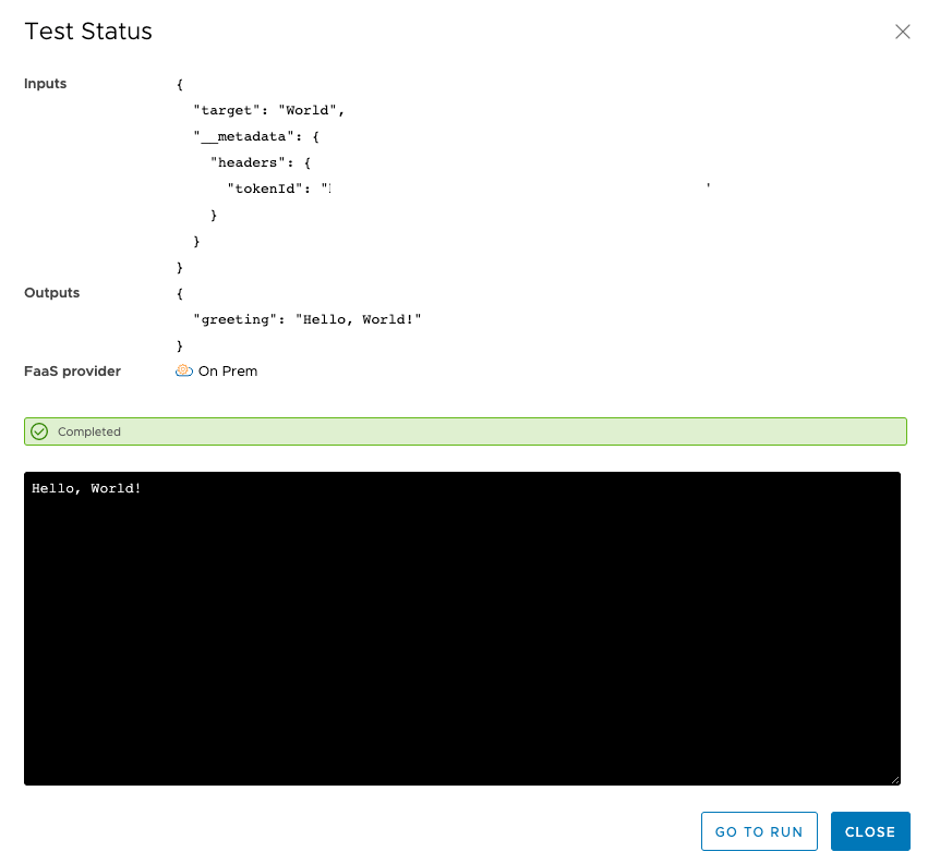The default action below includes a “Hello World” Python script – when you save and test and check the test status, you will see that “Hello, World” has been printed: