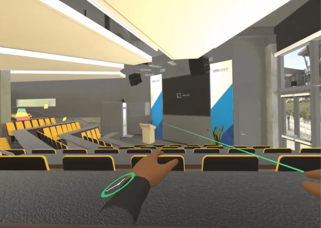 The meeting room can cater for roughly 200 attendees and they have done a fantastic job at recreating it. The light beams on the ceiling. The VMware banners. The windows and the exit doors. They’ve even replicated the imperfection of the room, such as the column obstructing the view!