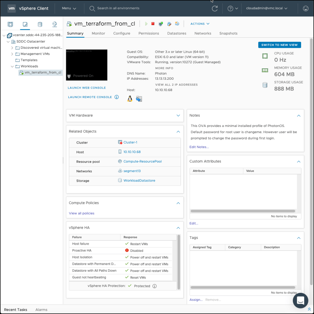 As you will see later, we will create a VM on the “subnet13” network (previously created by Terraform for NSX-T but could have been created by another means) and we will deploy it in the datastore specified above.