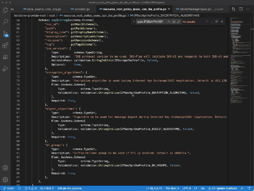 Sometimes I find the best way to learn a new programming language is by reverse engineering some existing code. So let’s have a look at what I’ve done to add the VPN functionality to the provider. I will focus on one of the types of resources needed to create a VPN: creating a IKE profile (essentially the encryption and algorithms settings for a VPN).