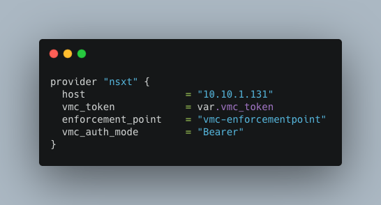 Our Terraform for NSX-T provider didn’t support this option yet but the developers kindly took my request and added this option below. It’s now possible to hit directly the NSX-T Manager ‘s private IP by specifying its private IP and by specifying the authentication mode to “Bearer” (see below) as the authentication changes when you’re not using the Reverse Proxy.