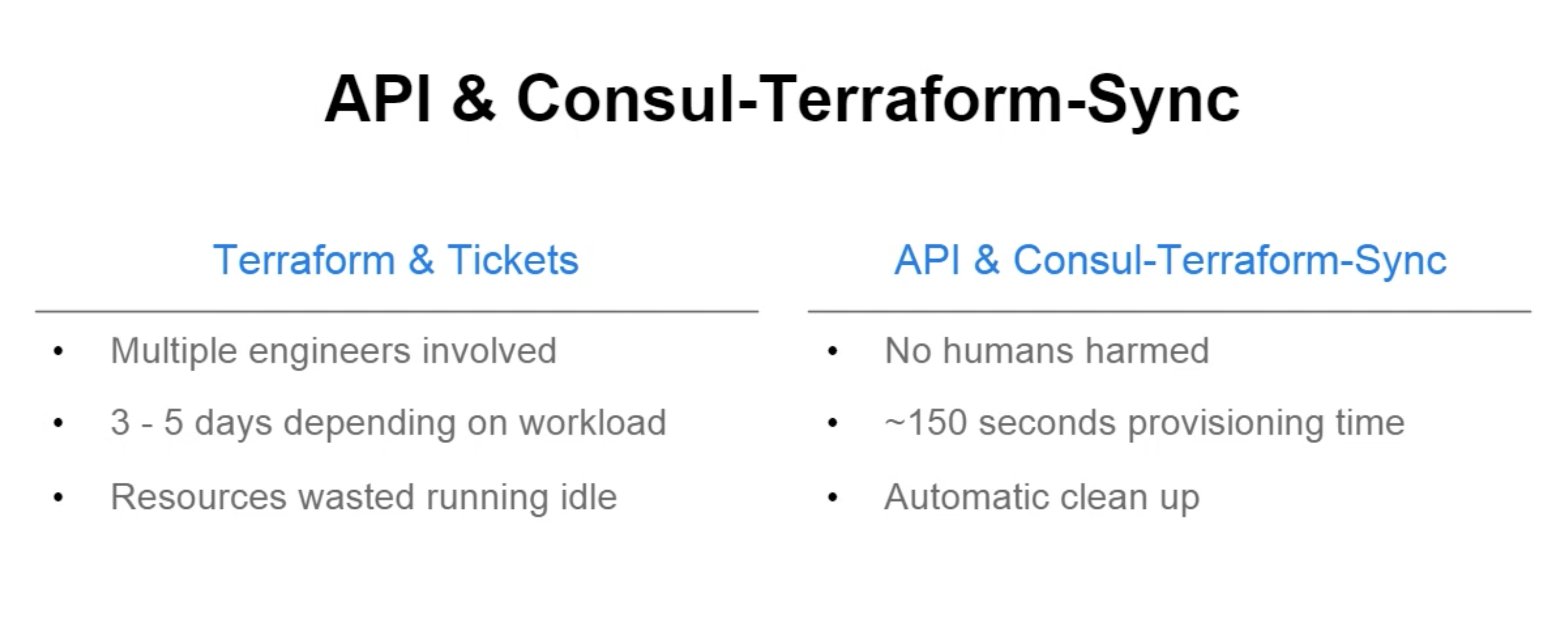 The premise of Consul-Terraform-Sync is that, once users register their services in a service register (Consul), it would automatically trigger the execution of Terraform to deploy these services. And every time the services are updated in the register, it would automatically sync the changes on the firewalls or load-balancers. No need for humans to get involved in the process.