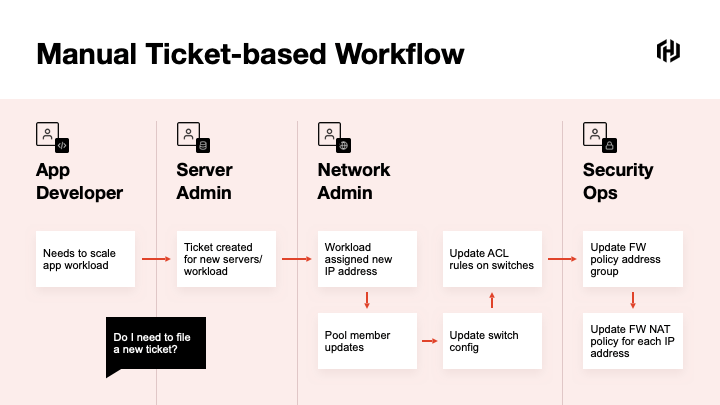 Take a load-balancer pool. If an app developer needs to scale and adds more servers to a pool, he/she shouldn’t have to go through multiple hoops and tickets to get that change through.