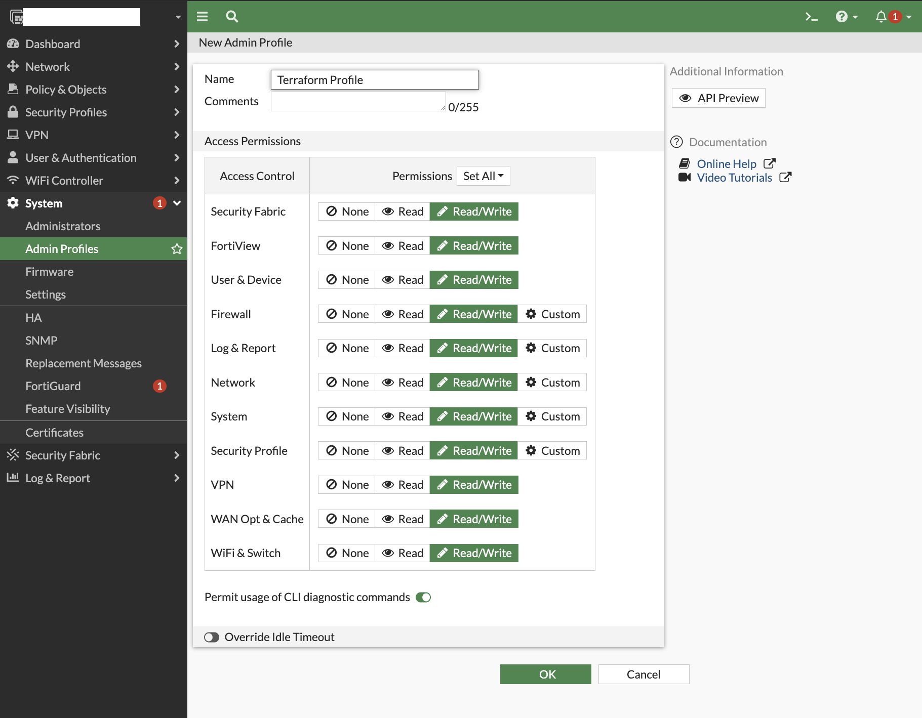 To set up Terraform with it, you’re going to need to create an API token. What you can do is create a new Admin Profile alongside a new REST API Admin.