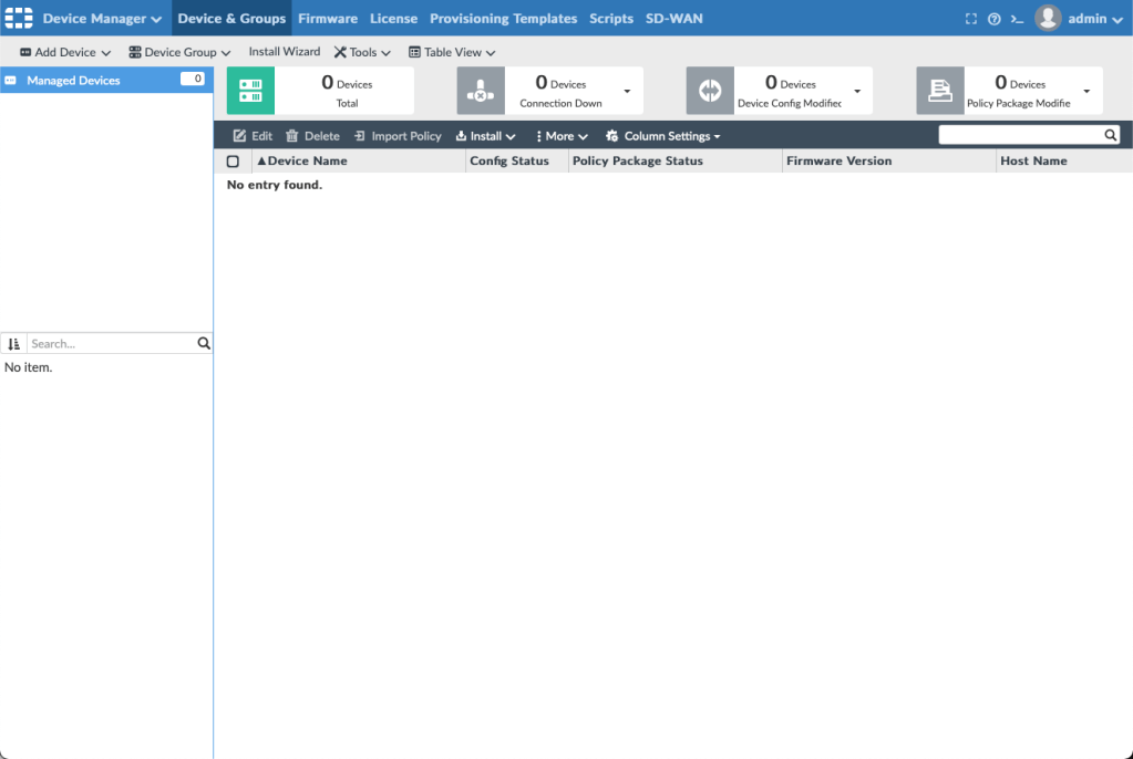 Just like in the previous post, I used the AWS Marketplace to deploy a Fortimanager. I used the AMI with a free 15-day license to get started and log onto the box with admin as the username and with the EC2 instance ID as the password.
