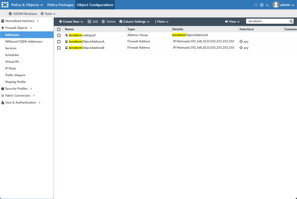 fortimanager_object_firewall_address.objectAddressB: Creation complete after 0s [id=terraformObjectAddressB]