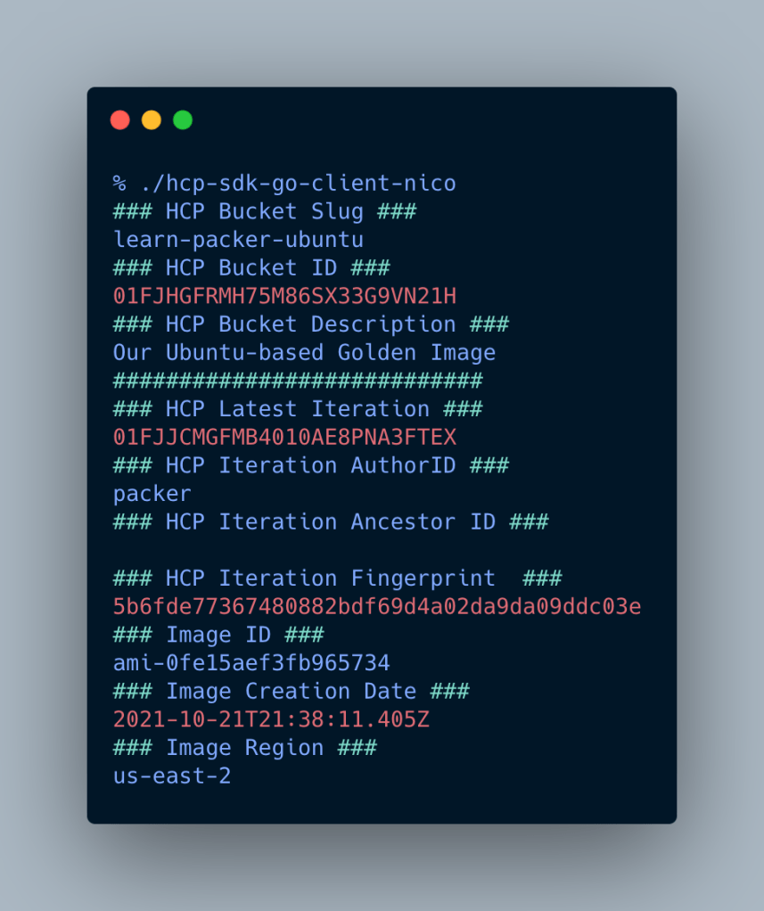 This is what my basic client will do when I run it: it tells me the name, ID and description of the HCP Packer Buckets, details about the latest Packer iteration (authorID, fingerprint) and about the image itself (AMI ID and which region and when it was built):