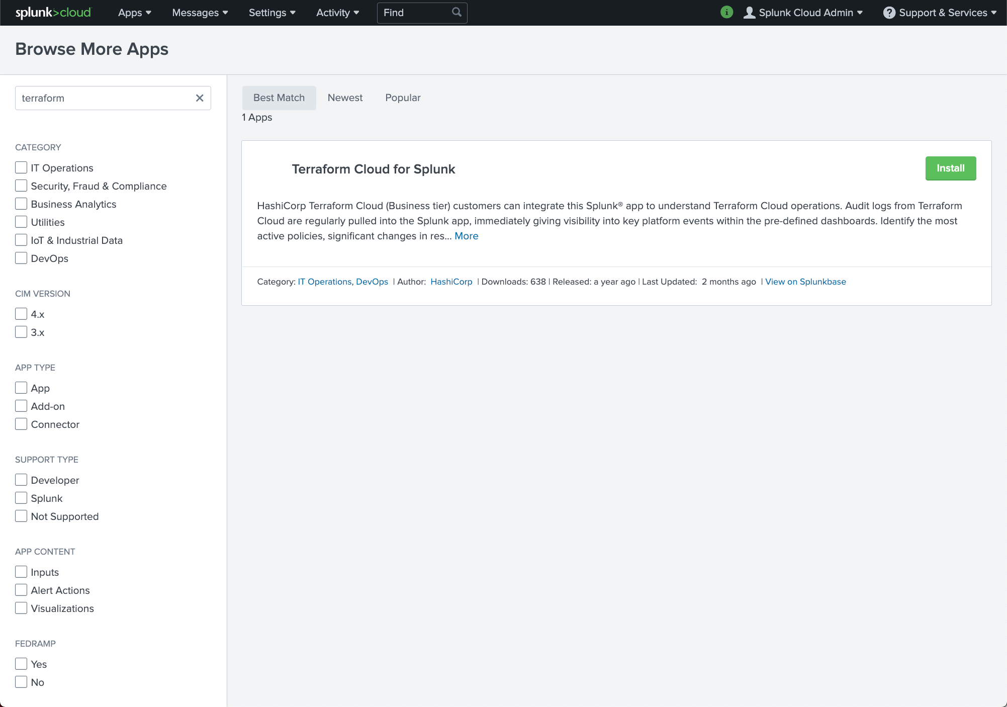 Install the Terraform Cloud for Splunk app.