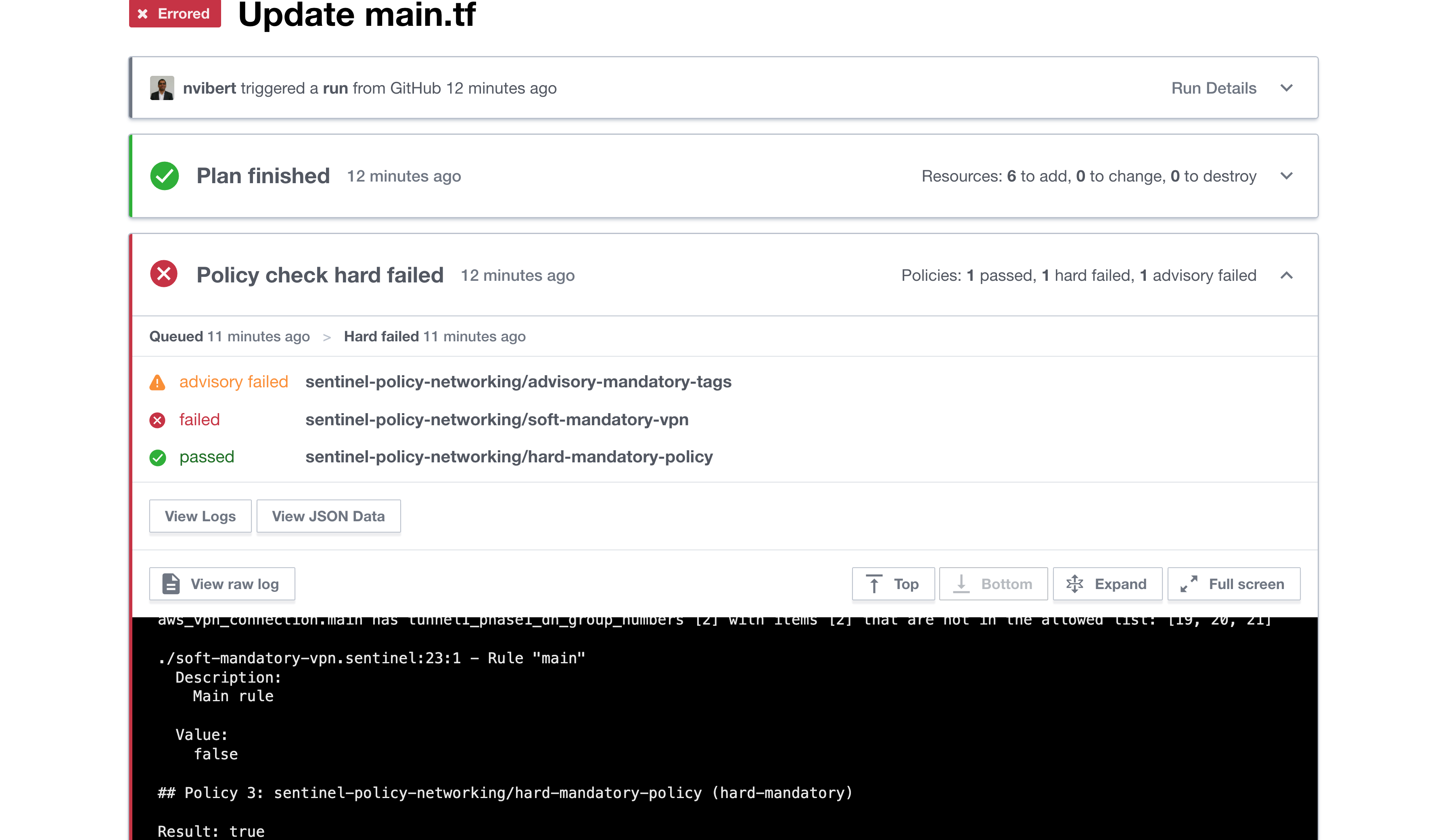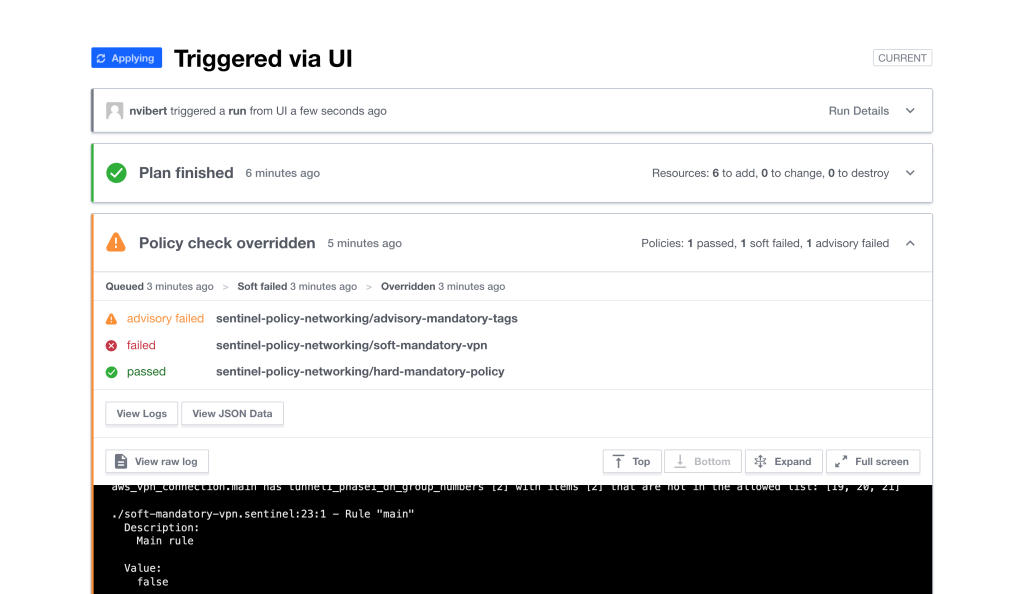 It’s pretty handy. For a specific policy-set (sentinel-policy-networking), it gives me all the runs that failed the hard-policy check, which specific policy failed and the log messages.