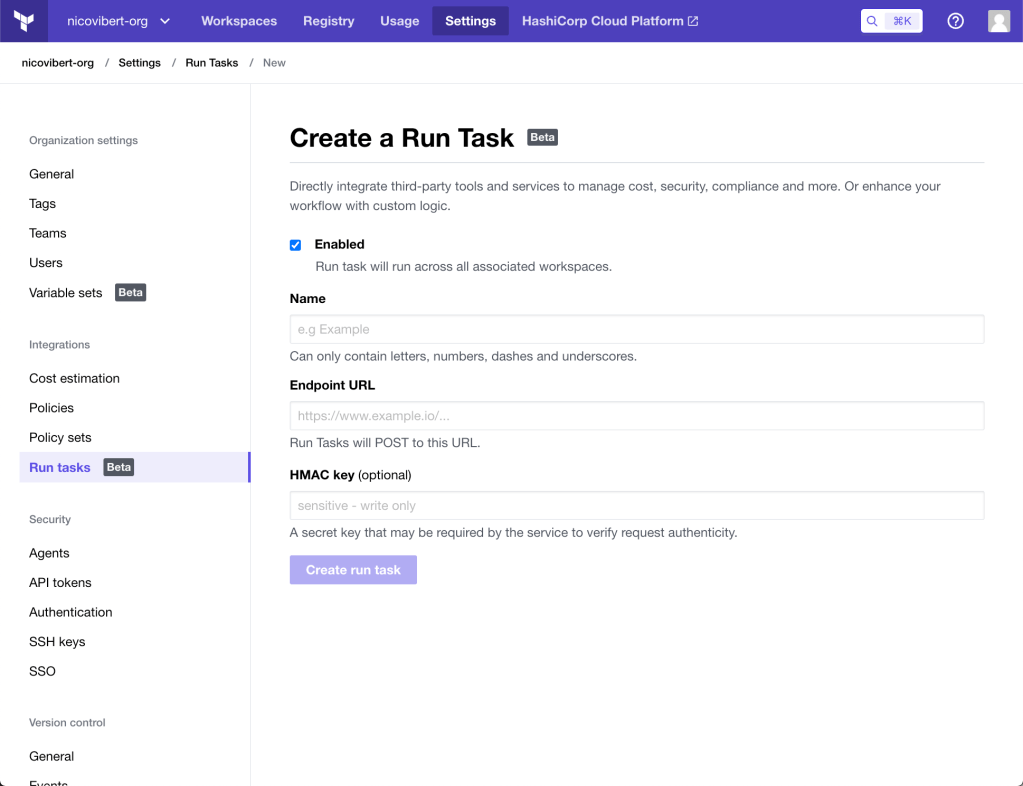 Input these parameters in Terraform Cloud >> Settings >> Run tasks to create your Run Task:
