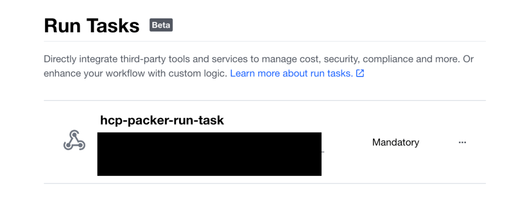 HCP Packer becomes particularly useful with Terraform Cloud through something called Run Tasks. Terraform Cloud introduced the use of ‘Run Tasks‘ last year – it’s a way to insert some logic and analysis done from a 3rd party during the Terraform execution. In our case, the 3rd party is going to be HCP Packer.