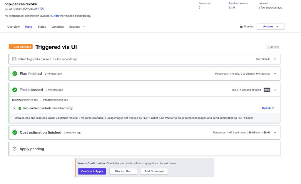 And when you start a Terraform Run, the Run Task will be executed between terraform plan and terraform apply: