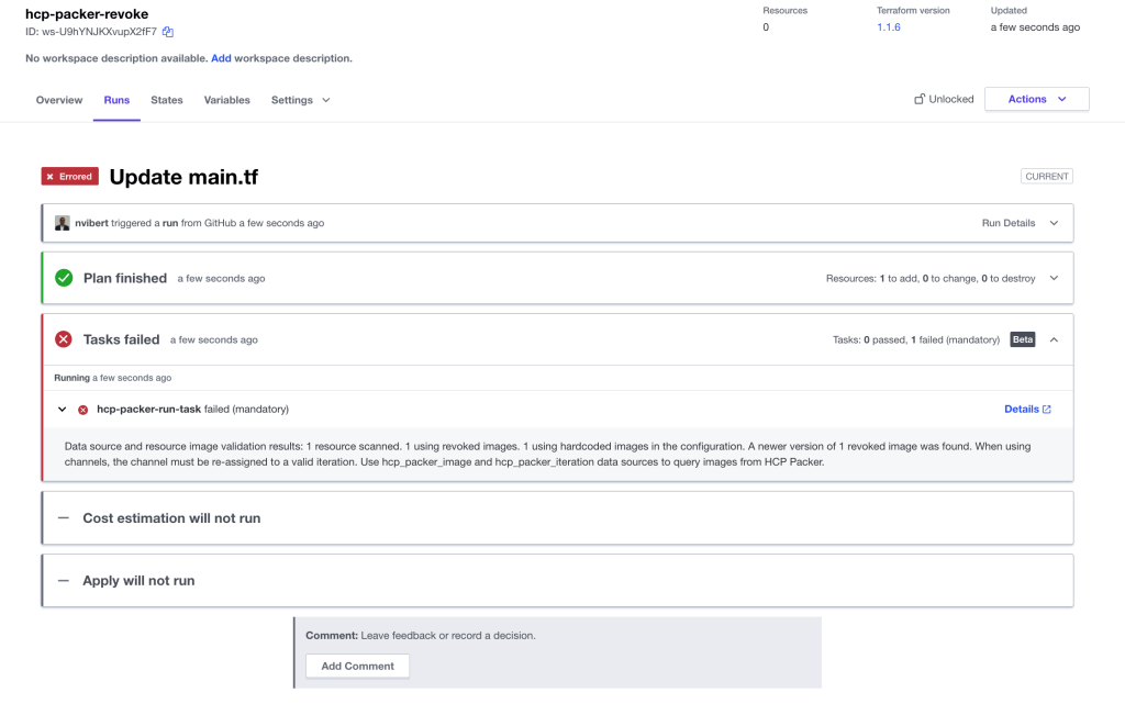 There are two enforcement levels for the Run Task – Advisory or Mandatory. As I selected “Mandatory”, you can see in the logs above that TFC will block the deployment as we’re using a revoked image. It also informs us that there is a more recent version of the image (from a more recent iteration).