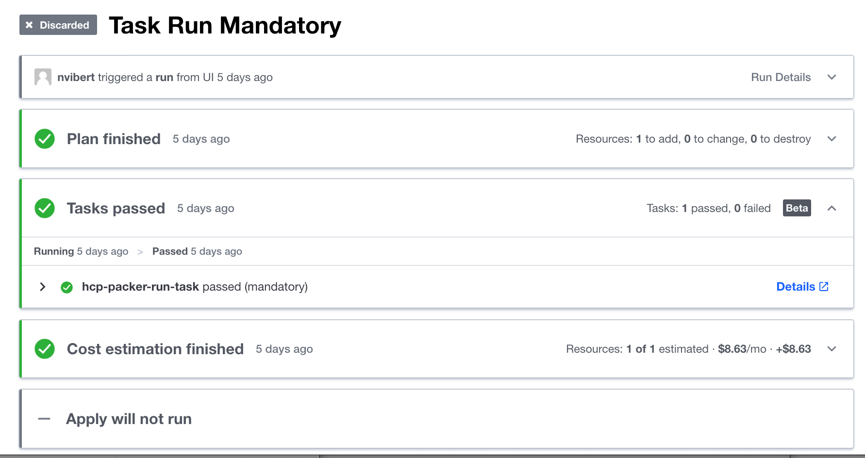 There are two enforcement levels for the Run Task – Advisory or Mandatory. As I selected “Mandatory”, you can see in the logs above that TFC will block the deployment as we’re using a revoked image. It also informs us that there is a more recent version of the image (from a more recent iteration).