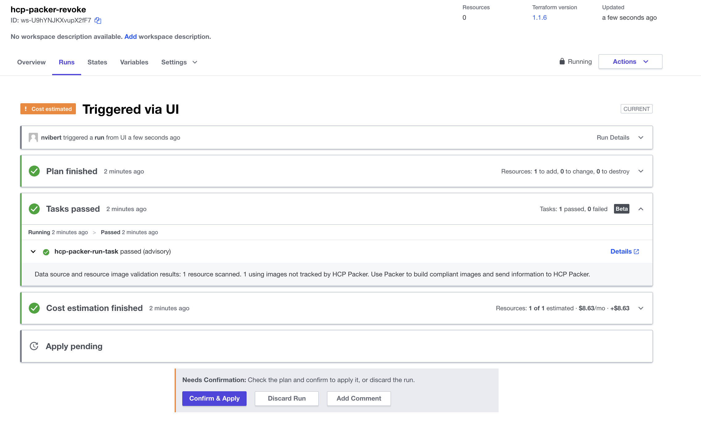 Terraform Cloud will connect to HCP Packer during the Run Task execution and will realize that the image is not tracked and managed by HCP Packer As it’s not a big deal, TFC just advises us we should ideally track this with HCP Packer: